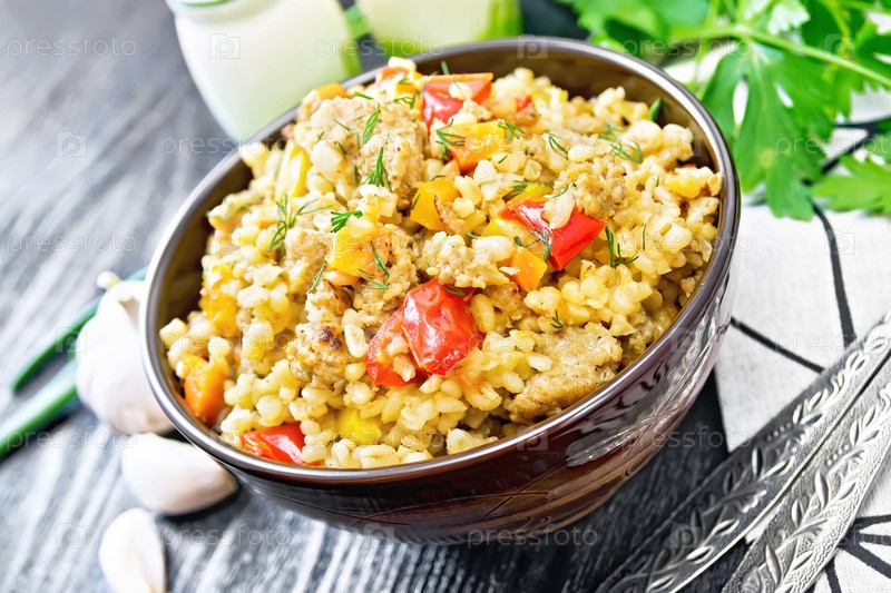 Жемчужная каша с фаршированным мясом в миске на деревянной доске