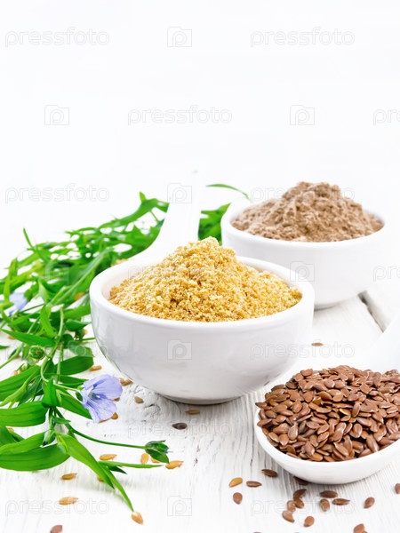 Клейн и фуражная лен в мисках на белой деревянной доске