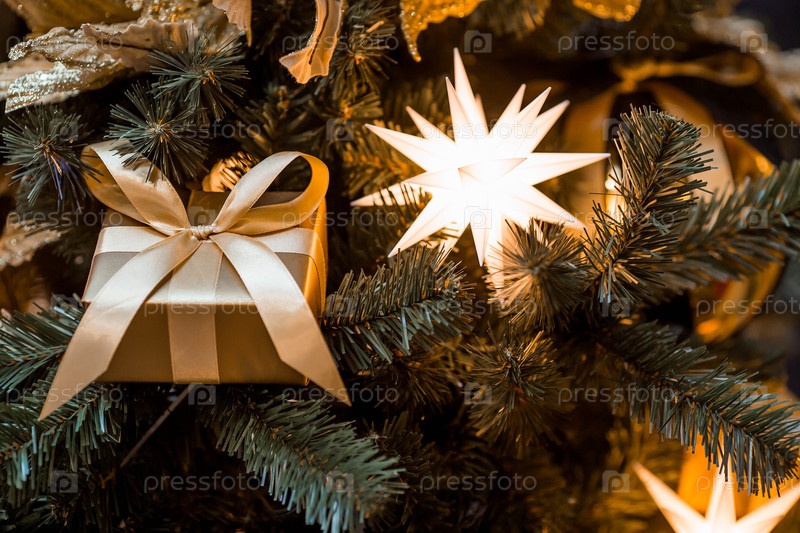 Рождественские игрушки и золотая коробка с подарками на рождественской елке в Москве.Концепция покупки и дарения подарков.Новогодняя открытка 2026