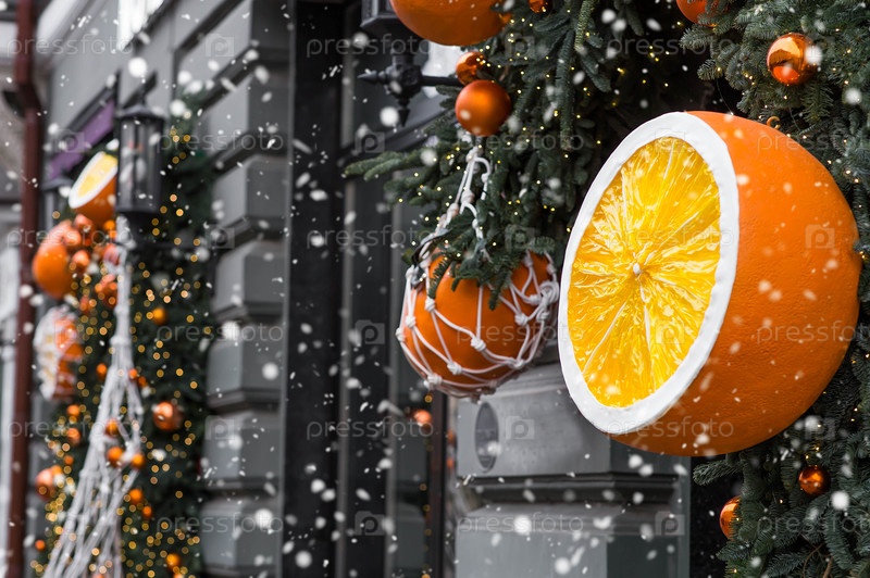 Мандаринки в мешке с струнами и рождественские украшения на улицах Москвы.С Новым годом 2026.Концепция подготовки ювелирных изделий к Рождеству