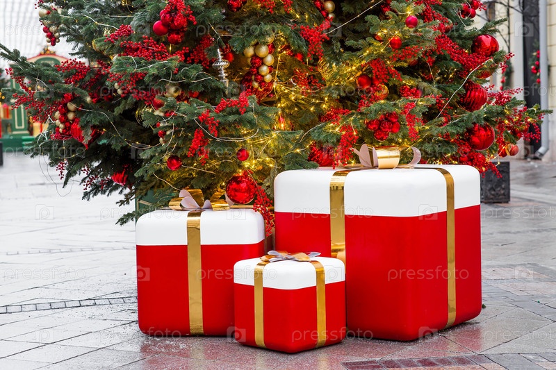 Невероятный рождественский фон. Праздничные игрушки и коробки с подарками на елке в Москве. Концепция украшений для праздника. Новогодняя открытка 2026