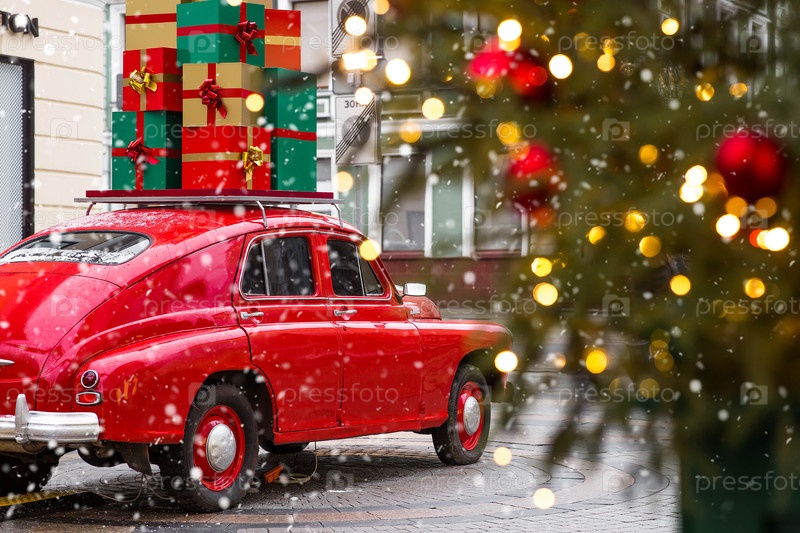 Концепция доставки подарков и товаров Рождественские подарки доставляются на крыше красного рождественского ретро автомобиля
