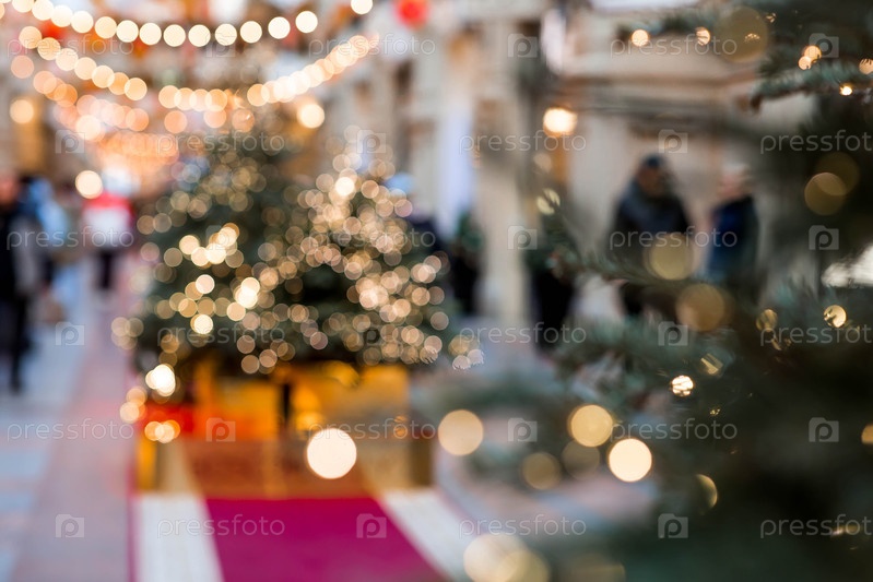 Абстрактный размытый рождественский фон с гирляндами на елке в теплых оттенках