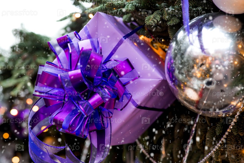 Рождественские игрушки и фиолетовые коробки для подарков на новогодней елке в Москве.Концепция покупки и дарения подарков.Новогодняя открытка 2026