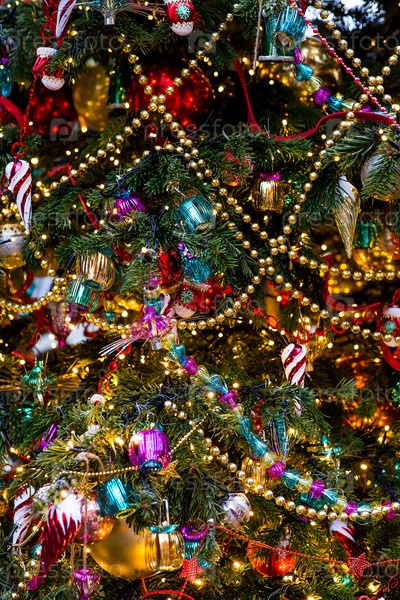 Красивый рождественский фон. Прекрасные праздничные игрушки на елке в Москве. Концепция подготовки и отделки для Нового 2026