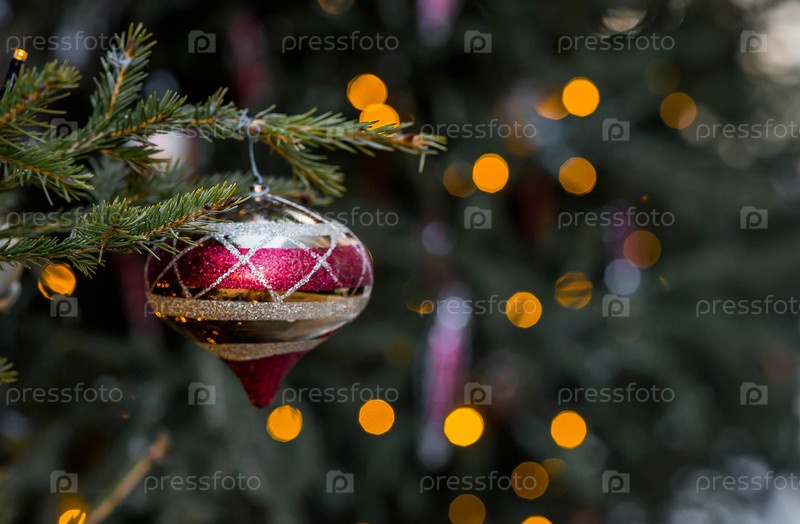 Красивый рождественский фон. Прекрасные праздничные игрушки на елке в Москве. Концепция подготовки и отделки для Нового 2026