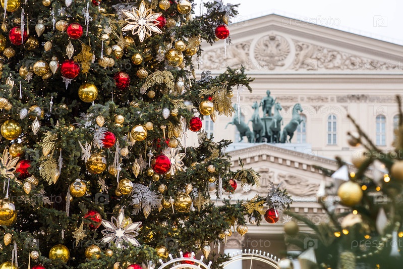 Рождественские украшения на улицах. Рождественные праздники, зимний пейзаж. Большой театр в центре Москвы. Россия, Москва, 2025