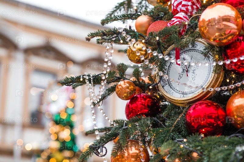 Золотые ретро-часы на рождественской елке. Часы показывают 12 часов. Красивый фон в канун Нового года или Рождества 2026