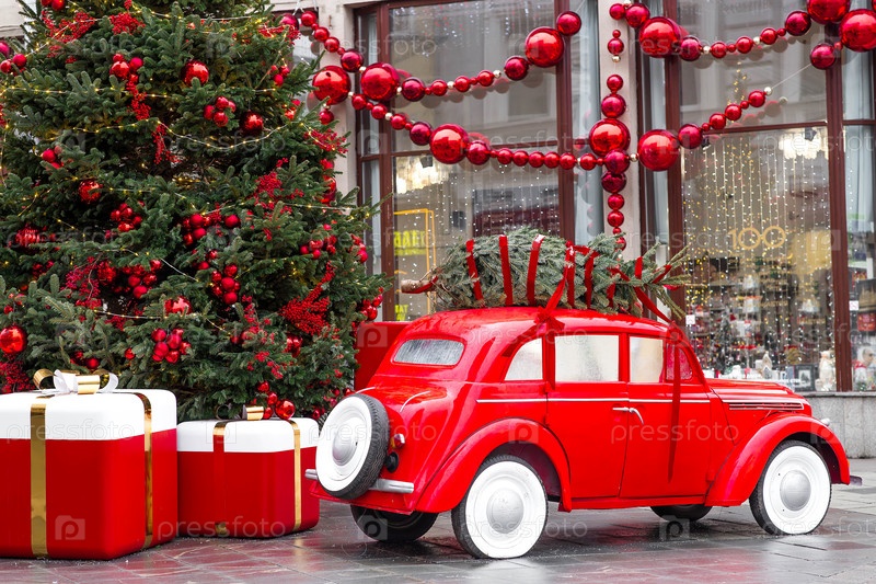 Красный рождественский вагон несет на крыше елку. Новогодняя ночь в Москве украшена. Концепция доставки продуктов