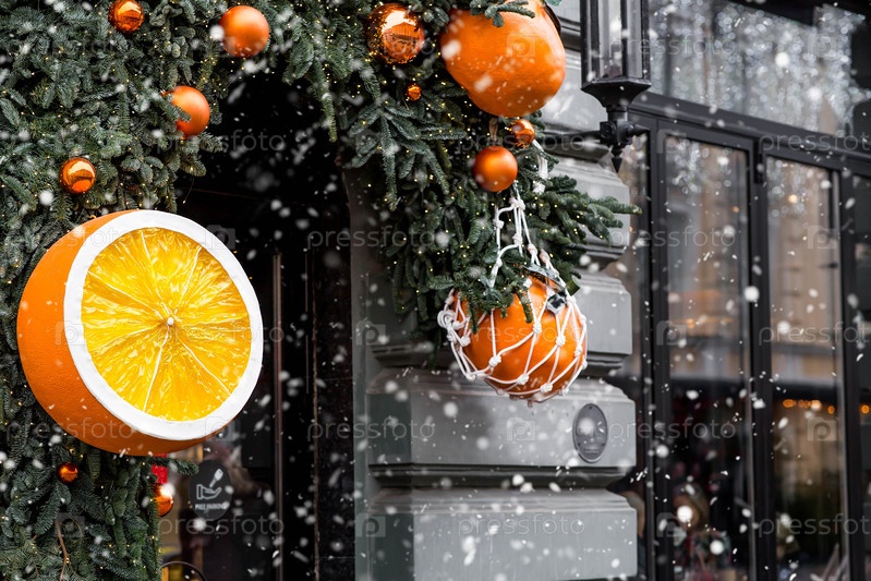 Мандаринки в мешке с струнами и рождественские украшения на улицах Москвы.С Новым годом 2026.Концепция подготовки ювелирных изделий к Рождеству