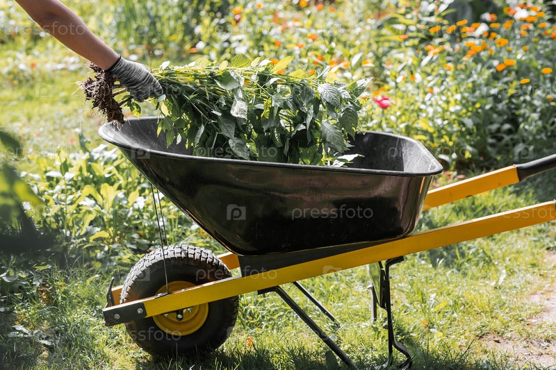 Молодая женщина работает на заднем дворе дома собирает траву в садовой тележке концепция садоводства и деревенской жизни летняя уборка сада