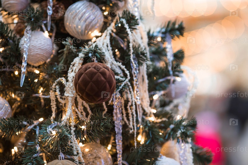 Красивый рождественский фон. Прекрасные праздничные игрушки на елке в Москве. Концепция подготовки и отделки для Нового 2026