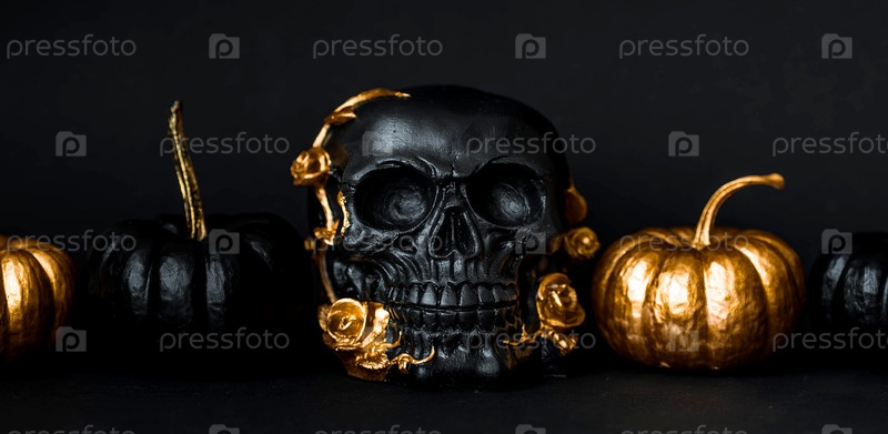 Чёрный череп с золотыми розами и тыквами. Декорация для Дня мертвых или Хэллоуина на черном фоне