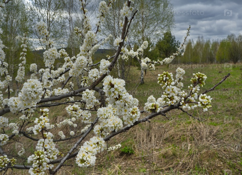 Одинокая слива в белом весеннем цвете на теплый майский день