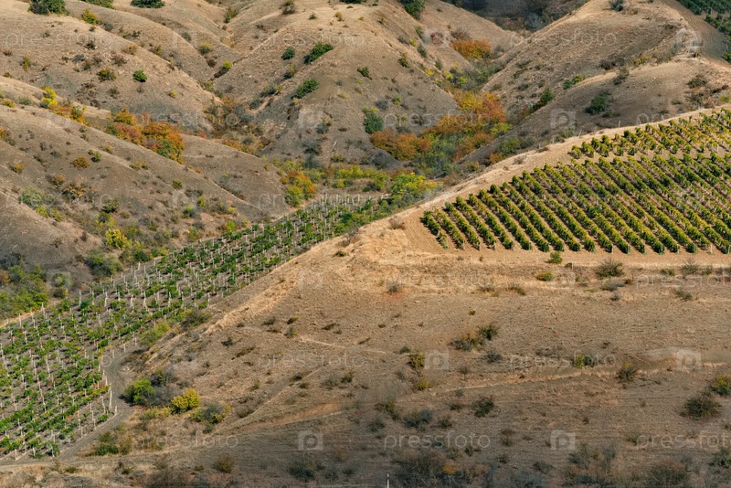 Великолепный вид на горные склоны, посеянные виноградником недалеко от города Судак
