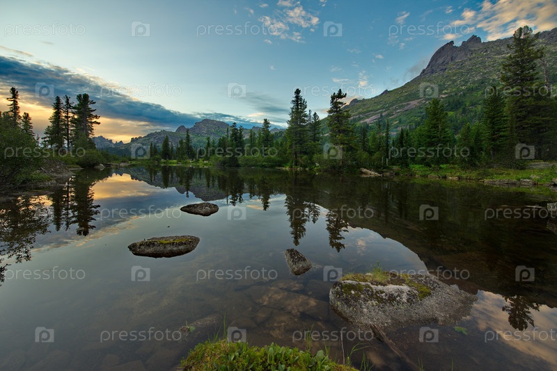 Красноярский край, Восточный Саянс.Летний вечер на берегу горное озеро Азур в природном горном парке Ергаки
