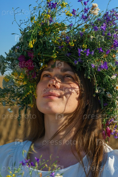 Портрет девушки в белом платье, славянского внешнего вида с венком диких цветов на голове.На фоне голубого неба и собранного поля