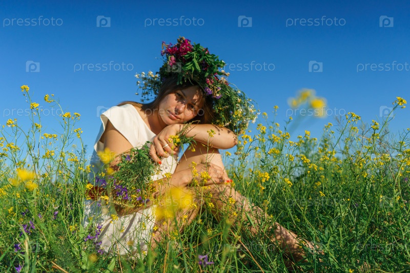 Девушка в белом платье славянского вида с букетом и венком диких цветов на голове сидит на лугу