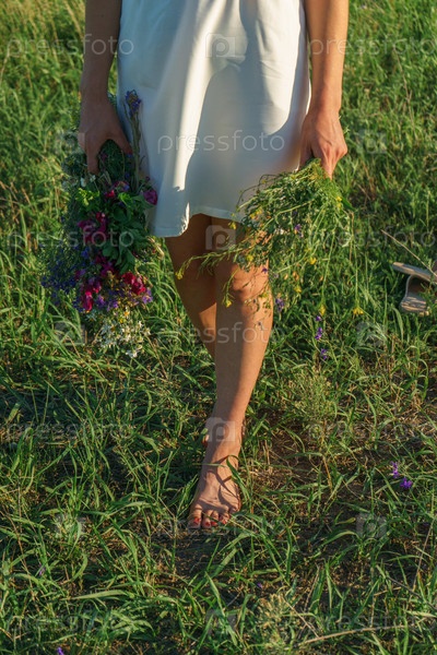 Девушка в белом платье несет букет и венок из диких цветов