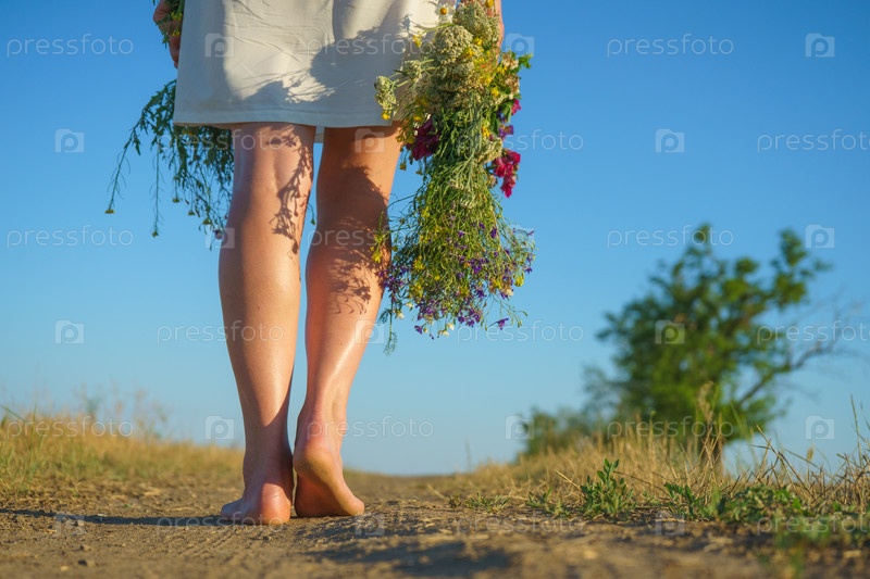 Босоногая девушка в белом платье несет букет и венок диких цветов. вид сзади, уезжая по грунтовой дороге