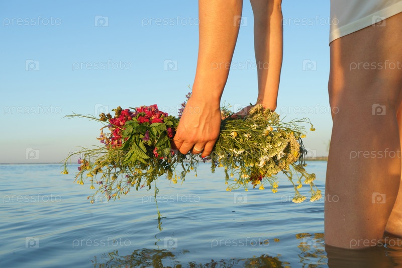 Девочка опускает в воду венок диких цветов