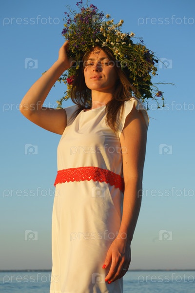 Портрет девушки в белом платье, славянского внешнего вида с венком диких цветов на голове