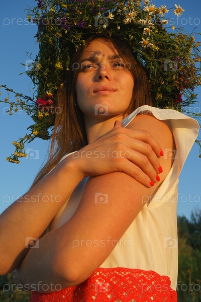 Портрет девушки в белом платье, славянского внешнего вида с венком диких цветов на голове