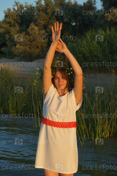 Портрет девушки в белом платье, славянского внешнего вида с венком диких цветов на голове