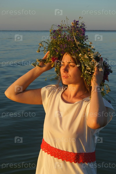 Портрет девушки в белом платье, славянского внешнего вида с венком диких цветов на голове