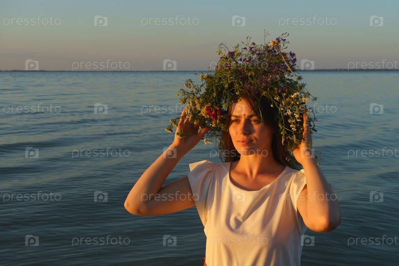 Портрет девушки в белом платье, славянского внешнего вида с венком диких цветов на голове