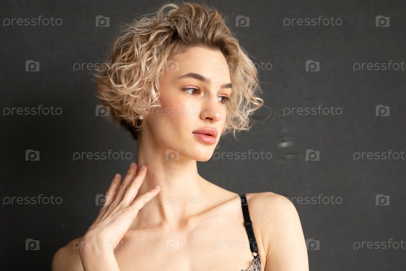 Портрет красивой молодой женщины с кудрявыми волосами в студии