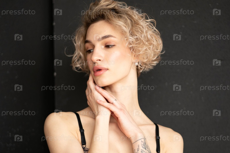 Портрет красивой молодой женщины с кудрявыми волосами в студии