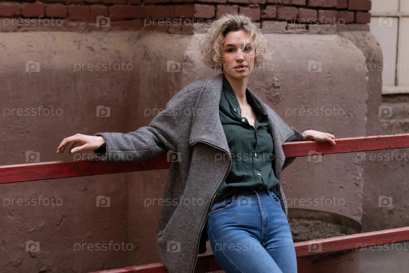 Красивая молодая женщина позирует снаружи в сером пальто
