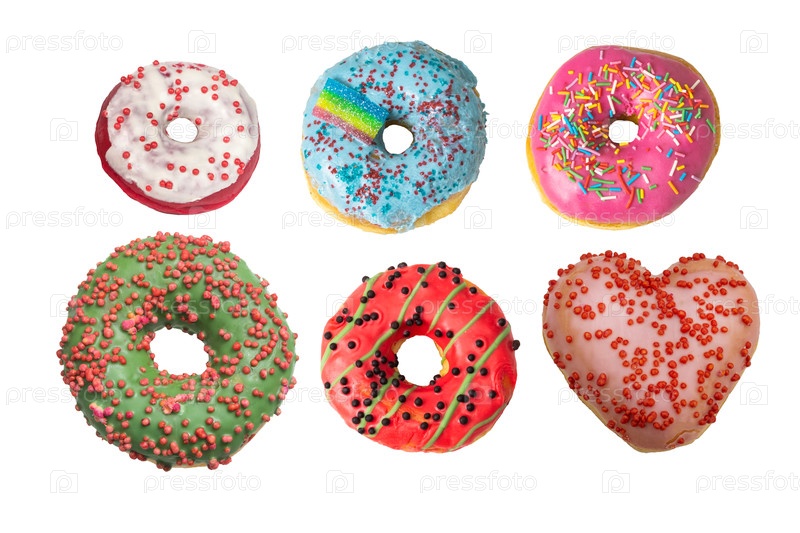 Набор красочных пончиков с различными посыпаниями на белом фоне. Изолированный. Плоский. Вид сверху