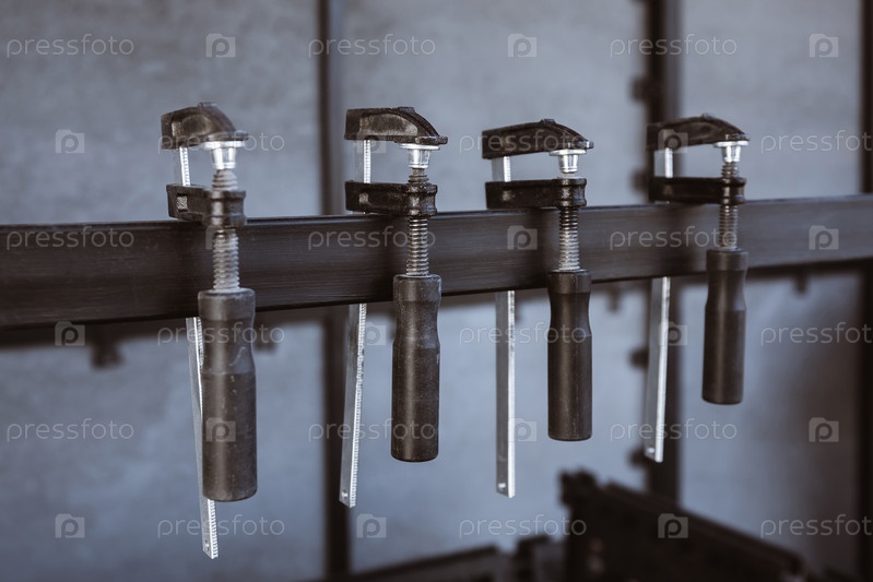 Четыре черных сцепления установлены на металлической стойке на строительной площадке.Скрепления предназначены для надежного хранения материалов на месте
