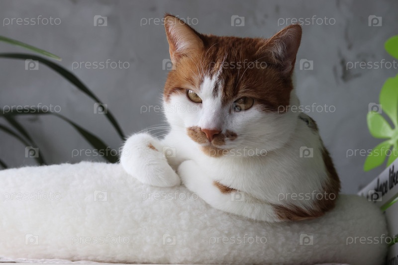 Красно-белый кот, сидящий в постели с зажатыми лапами и смотрящий на камеру