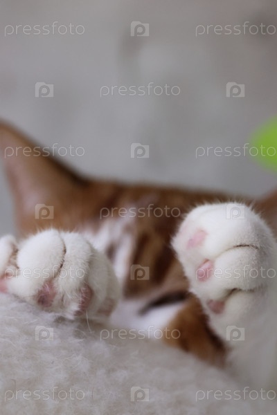 глаз кота с поднятым взглядом, встроенный между вытянутыми передними лапами. сосредоточьтесь на лапах. красно-белый кот. близко