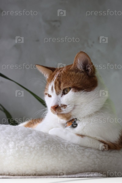Красно-белый кот сидит в постели с продуманным выражением лица