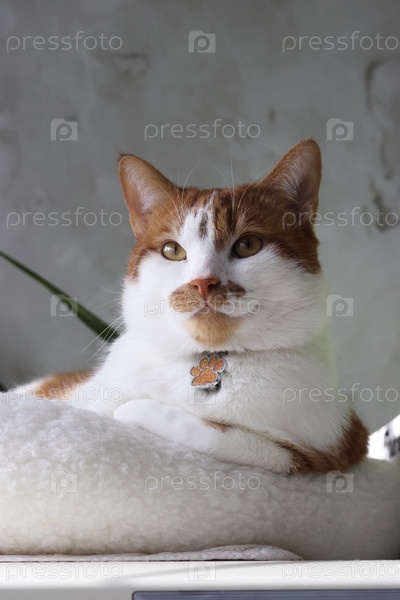 Кот сидит с задумчивым взглядом.Кот красный с белыми пятнами.Закрыть