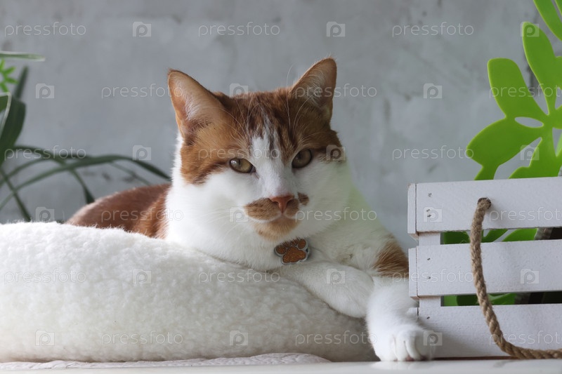 Кот сидит с задумчивым взглядом.Кот красный с белыми пятнами.Закрыть