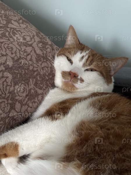 Сонное, задумчивое лицо красно-белой кошки