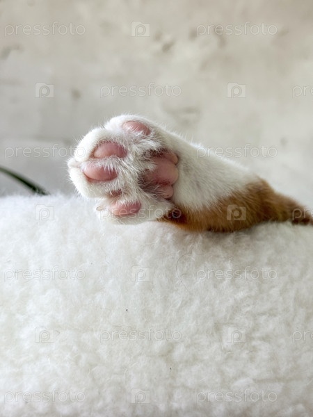 Красно-белая кошачая лапа, вытянутая из кровати