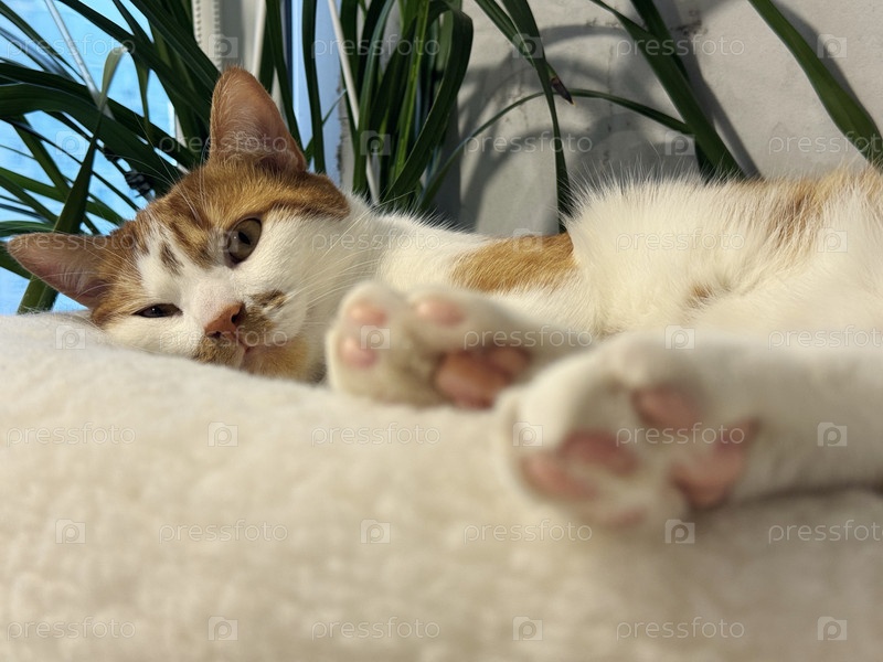 Красно-белый кот или кошка, лежащая на боку и отдыхающая в кровати питомца