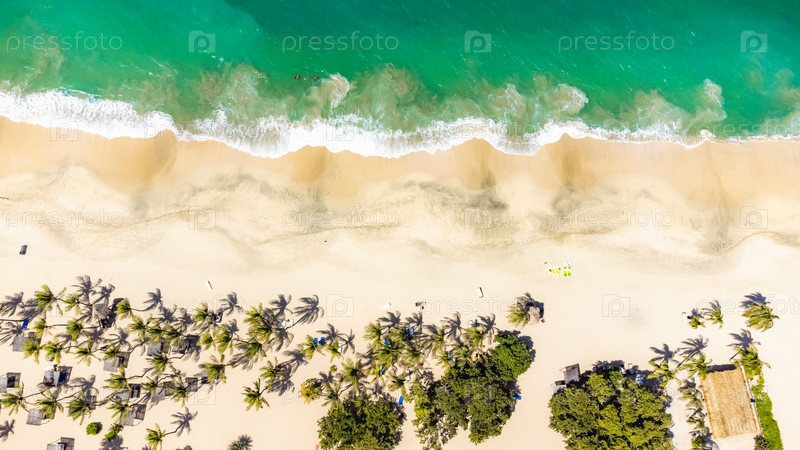 Вид с воздуха на тропический пляж с волнами и пальмами