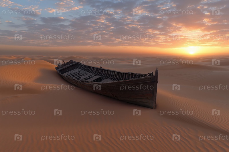 Заброшенная лодка в пустыне при закате солнца