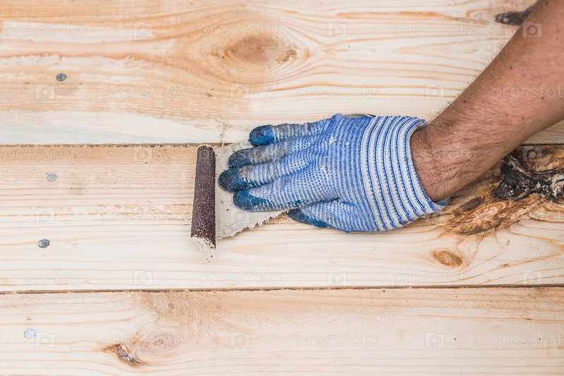 Плотник в тканевых перчатках вручную полирует деревянные доски песочной бумагой для шлифования