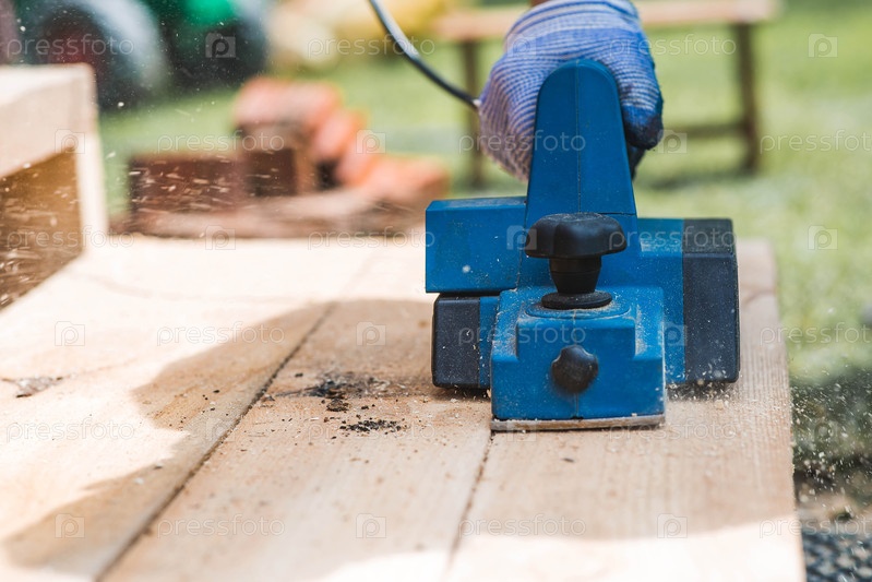 Ручной электрический планер в руках ремесленника. Человек планирует доски с помощью электроинструмента. Производство деревянных изделий. Строительство, обработка древесины