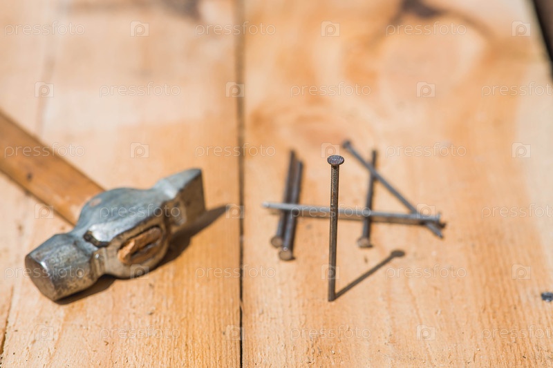Закройте молот и гвозди на деревянных досках.Ручные инструменты, старые строительные орудия