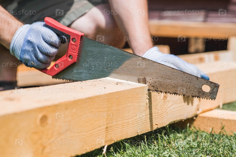 Рука в руке ремесленника. Человек пил балки с помощью инструмента. Производство деревянных изделий. Строительство, обработка древесины