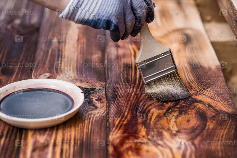 Защита и покрытие деревянных досок.Рабочий наносит защитное деревянное пятно щеткой.Процесс восстановления деревянного пола